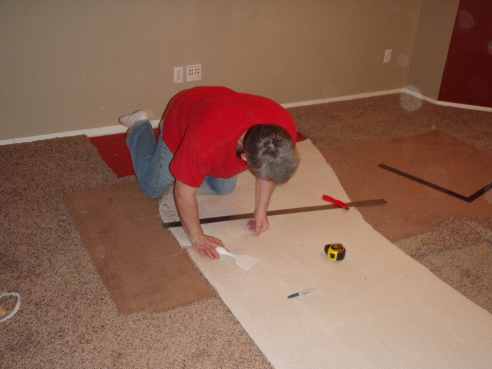Here is Bill cutting and piecing together the carpet for under the entertainment center.